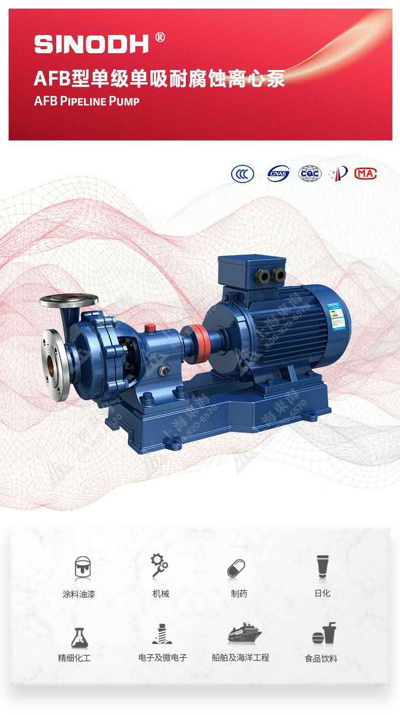 AFB型单级单吸悬臂式耐腐蚀离心泵,为沈阳远航重型机械有限公司自主研发生产。本系列产品适用于输送不含固体颗粒,有腐蚀性液体。被输送介质温度为-20℃~200℃,泵的进口压力不能大于0.2MPa,广泛用于石油、化工、冶金、合成纤维、制药、食品、酿造等工业部门,也可供工矿、企业及城市供水、排水之用。