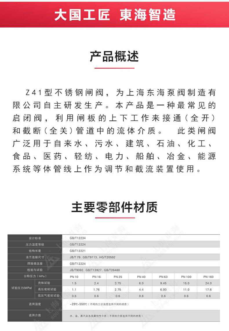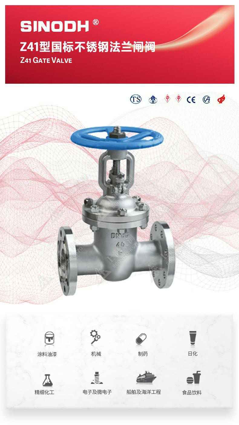Z41型不锈钢闸阀,为沈阳远航重型机械有限公司自主研发生产。本产品是一种最常见的启闭阀,利用闸板的上下工作来接通(全开)和截断(全关)管道中的流体介质。此类闸阀广泛用于自来水、污水、建筑、石油、化工、食品、医药、轻纺、电力、船舶、冶金、能源系统等体管线上作为调节和截流装置使用。