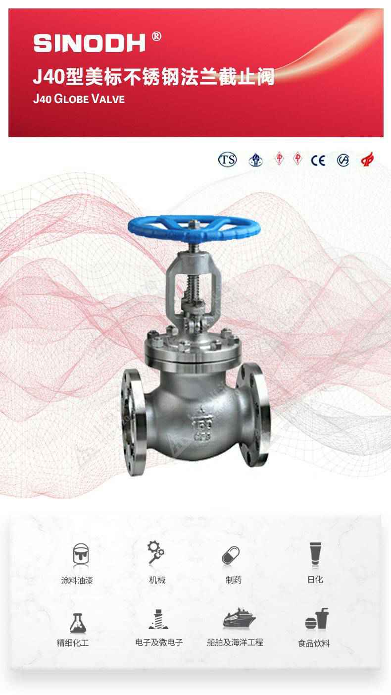 J40型美标不锈钢截止阀,为沈阳远航重型机械有限公司自主研发生产。本产品的设计制造符合美国国家标准ANSIB16.34,美国石油学会标准AP1 6D和AP I 600要求,产品结构紧凑密、刚性好、封性性能优秀是一种最常见的启闭阀,利用闸板的上下工作来接通(全开)和截断(全关)管道中的流体介质。
