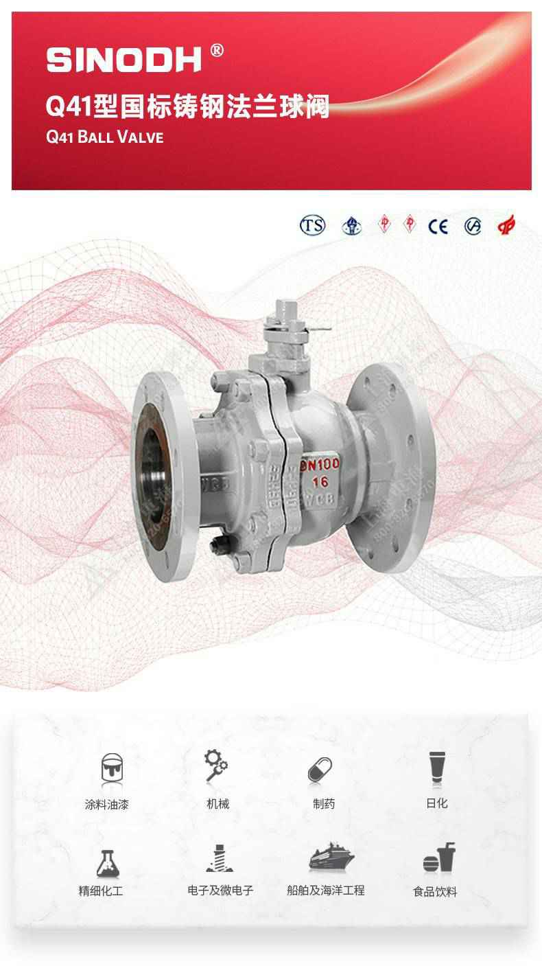 Q41型国标铸钢法兰球阀,为沈阳远航重型机械有限公司自主研发生产。本产品设计制造标准符合GB/T12237、GB/T12224标准。该产品的球体在介质压力作用下球体能产生一定的位移并紧压在出口端的密封面上,保证出口端密封。适用于水、溶剂、酸和天然气等一般工业介质也适用于工况恶劣的介质,如氧气、过氧化氢、甲烷和乙烯等介质。